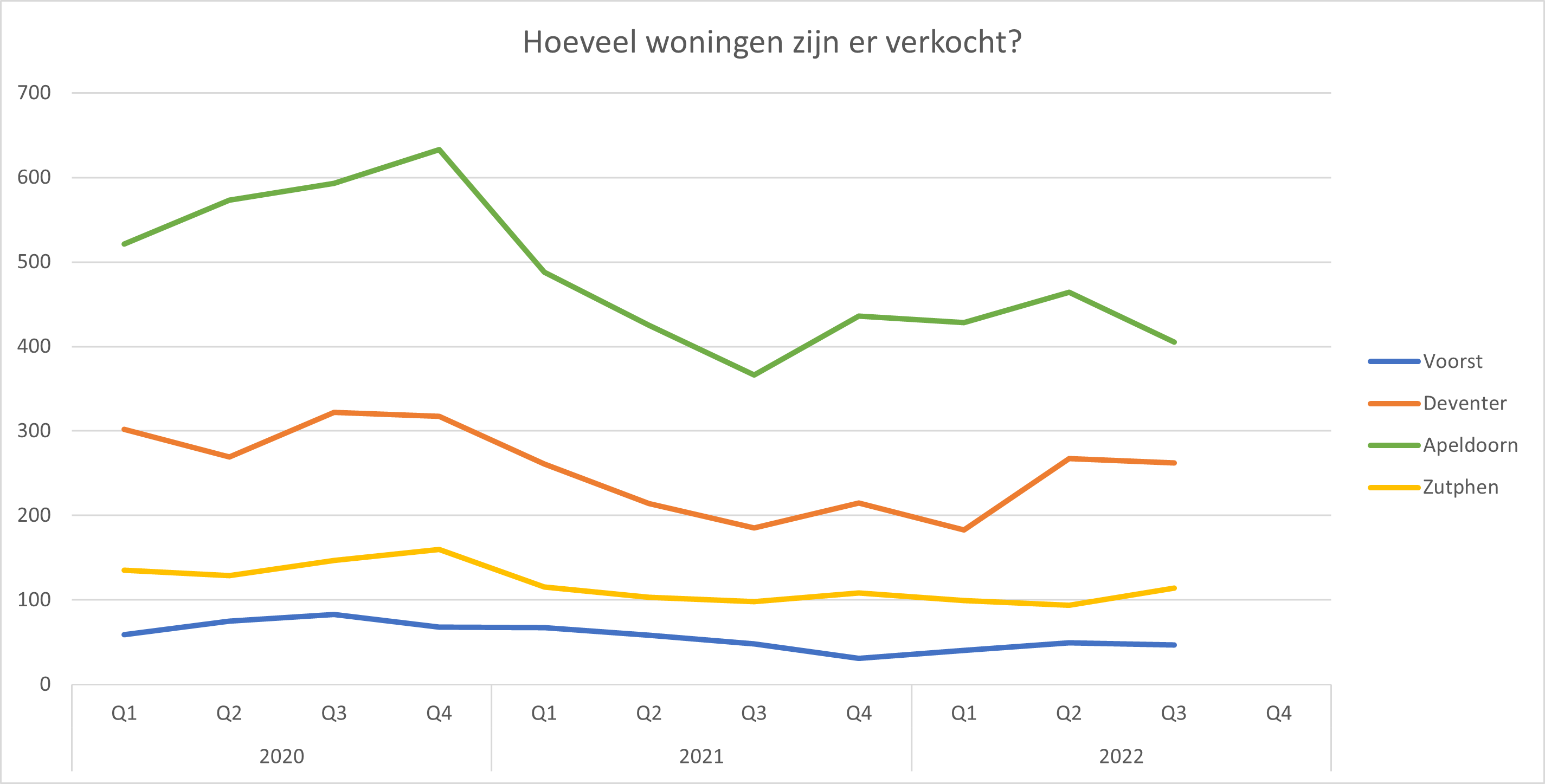 - Met een gemiddelde vraagprijs van €495.000 (Voorst), €315.000 (Deventer), €349.500 (Apeldoorn) en €298.000 (Zutphen), zien we ten opzichte van Q2 een daling van respectievelijk 1%, 1,6%, 0,1% en 8,3%.